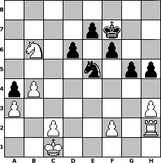 game notation in PGN-format [Event "Weinprobe 2018"] [Site "www.myChess.de"] [Date "2018.10.01"] [Round "1"] [White "Rotstift10"] [Black "Seneca"] [ECO "B07"] [WhitemyELO "1608"] [BlackmyELO "1447"] [Result "1-0"] [TimeControl "10/1728000"] [WhiteDays "19"] [BlackDays "20"] [MyChessNo "113170"] 1. e4 d6 2. d4 Nf6 3. Nc3 g6 4. Be3 c6 5. Bd3 Bg7 6. h3 O-O 7. Nge2 b5 8. b4 a5 9. a3 a4 10. d5 cxd5 11. exd5 Bb7 12. Bxb5 Nxd5 13. Bd4 Nxc3 14. Bxc3 Bxg2 15. Rh2 Bf3 16. Bxg7 Kxg7 17. Qd4+ f6 18. Nf4 Qc8 19. Qd3 Bc6 20. Bc4 Qb7 21. Ne6+ Kh8 22. Nxf8 Be4 23. Qe2 Bf3 24. Qe3 Qe4 25. Qxe4 Bxe4 26. O-O-O Nc6 27. Nd7 Bf5 28. Nb6 Ra7 29. Bd3 Bxd3 30. Rxd3 g5 31. Nd5 Ne5 32. Rc3 Kg7 33. Rc7 Rxc7 34. Nxc7 h5 35. Nd5 Kf7 36. Nb6 1-0 position notation in FEN-format 8/4pk2/1N1p1p2/4n1pp/pP6/P6P/2P2P1R/2K5 - - - 3 36 Captured white pieces: Captured black pieces: Click on a captured piece in order to display the desired move!