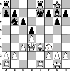 game notation in PGN-format [Event "Herbstturnier"] [Site "www.myChess.de"] [Date "2004.11.18"] [Round "1"] [White "Joschi"] [Black "Chelly"] [ECO "C42"] [WhitemyELO "1607"] [BlackmyELO "1613"] [Result "1/2-1/2"] [TimeControl "10/864000"] [WhiteDays "17"] [BlackDays "10"] [MyChessNo "8185"] 1. e4 e5 2. Nf3 Nf6 3. Nxe5 d6 4. Nf3 Nxe4 5. d4 Qe7 6. Be2 Bg4 7. Be3 Nd7 8. Nbd2 Nxd2 9. Qxd2 d5 10. Ng5 Bxe2 11. Qxe2 g6 12. O-O Bg7 13. c3 O-O 14. Qb5 Nb6 15. Rfe1 Rfe8 16. Nf3 c6 17. Qd3 1/2-1/2 position notation in FEN-format r3r1k1/pp2qpbp/1np3p1/3p4/3P4/2PQBN2/PP3PPP/R3R1K1 - - - 1 17 Captured white pieces: Captured black pieces: Click on a captured piece in order to display the desired move!