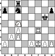 game notation in PGN-format [Event "HIGHLAND QUEEN I 2012"] [Site "www.myChess.de"] [Date "2012.03.01"] [Round "1"] [White "muetoe"] [Black "martinus"] [ECO "B31"] [WhitemyELO "1797"] [BlackmyELO "1743"] [Result "1-0"] [TimeControl "10/2592000"] [WhiteDays "15"] [BlackDays "28"] [MyChessNo "80261"] 1. e4 c5 2. Nf3 Nc6 3. Bb5 g6 4. Bxc6 bxc6 5. O-O Bg7 6. c3 d5 7. Qa4 Bd7 8. d3 e6 9. Nbd2 e5 10. Nb3 c4 11. dxc4 dxe4 12. Ng5 Nf6 13. Nc5 O-O 14. Rd1 Qc7 15. Nxd7 Nxd7 16. Nxe4 Nb6 17. Qa5 Rac8 18. b3 Rfd8 19. Bg5 Rxd1+ 20. Rxd1 Nd7 21. Qxc7 Rxc7 22. Bd8 Rb7 23. Ba5 Nf8 24. Nc5 Rb8 25. f3 Bh6 26. Kf2 f5 27. Bc7 Re8 28. Rd6 e4 29. fxe4 Rc8 30. Rxc6 Bf4 31. Na6 Kf7 32. exf5 gxf5 33. Rc5 Ne6 34. Rxf5+ Kg6 35. Rxf4 Nxc7 36. Nc5 1-0 position notation in FEN-format 2r5/p1n4p/6k1/2N5/2P2R2/1PP5/P3PKPP/8 - - - 1 36 Captured white pieces: Captured black pieces: Click on a captured piece in order to display the desired move!