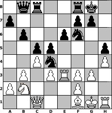 game notation in PGN-format [Event "Offenes CP Chess960 Turnier 1"] [Site "www.myChess.de"] [Date "2013.06.12"] [Round "1"] [White "Winston"] [Black "Jessica"] [Variant "Fischerrandom"] [SetUp "1"] [FEN "bqrnnbkr/pppppppp/8/8/8/8/PPPPPPPP/BQRNNBKR w KQkq - 0 1"] [WhitemyELO "1456"] [BlackmyELO "1500"] [Result "1-0"] [TimeControl "10/3456000"] [WhiteDays "40"] [BlackDays "33"] [MyChessNo "88735"] 1. b3 b6 2. c4 e6 3. Nf3 Ba3 4. Bb2 Bxb2 5. Nxb2 c5 6. Qd3 Nf6 7. Re1 Be4 8. Qc3 Nc6 9. d3 Bxf3 10. exf3 Nd4 11. Re3 O-O 12. g3 h5 13. h4 d5 14. Qc1 1-0 position notation in FEN-format 1qr2rk1/p4pp1/1p2pn2/2pp3p/2Pn3P/1P1PRPP1/PN3P2/2Q2BKR - K - 1 14 Captured white pieces: Captured black pieces: Click on a captured piece in order to display the desired move!