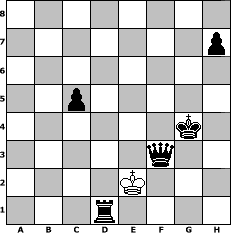 game notation in PGN-format [Event "Novemberturnier"] [Site "www.myChess.de"] [Date "2004.11.04"] [Round "1"] [White "Andylein1989"] [Black "Seneca"] [ECO "C62"] [WhitemyELO "1505"] [BlackmyELO "1528"] [Result "0-1"] [TimeControl "10/2592000"] [WhiteDays "179"] [BlackDays "180"] [MyChessNo "7768"] 1. e4 e5 2. Nf3 Nc6 3. Bb5 d6 4. O-O Nf6 5. Bxc6+ bxc6 6. d3 Be7 7. d4 Nxe4 8. dxe5 d5 9. Nbd2 Nc5 10. b3 O-O 11. Ba3 Bg4 12. Bxc5 Bxc5 13. h3 Bh5 14. Qe1 Bb4 15. Nd4 Bc3 16. e6 Qd6 17. exf7+ Rxf7 18. g4 Bg6 19. Qe3 Bxa1 20. Rxa1 Raf8 21. Rf1 c5 22. Nb5 Qb6 23. c4 a6 24. Na3 d4 25. Qe2 Qd6 26. Ne4 Qe5 27. Re1 Bxe4 28. Qxe4 Qxe4 29. Rxe4 Rxf2 30. Re5 Rxa2 31. Nb1 Rb2 32. Re1 Rxb3 33. Rc1 Rxh3 34. Rc2 Rff3 35. Rg2 Rb3 36. Nd2 Rb2 37. Ne4 Rxg2+ 38. Kxg2 Rc3 39. Kf2 Rxc4 40. Ke2 Kf7 41. Ng5+ Kg6 42. Ne6 a5 43. Nxc7 a4 44. Kd3 Rc3+ 45. Ke4 a3 46. Nb5 a2 47. Nxc3 a1=Q 48. Nd5 Qh1+ 49. Ke5 d3 50. Nf4+ Kg5 51. Ne6+ Kxg4 52. Nxg7 d2 53. Nf5 Qh5 54. Ke4 Qxf5+ 55. Ke3 d1=R 56. Ke2 Qf3# 0-1 position notation in FEN-format 8/7p/8/2p5/6k1/5q2/4K3/3r4 - - - 2 57 Captured white pieces: Captured black pieces: Click on a captured piece in order to display the desired move!