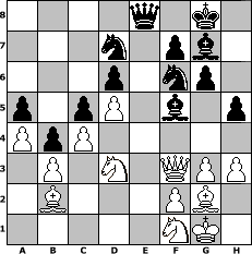 game notation in PGN-format [Event "Zum Sommeranfang"] [Site "www.myChess.de"] [Date "2017.06.11"] [Round "1"] [White "deepsabel"] [Black "larlinde"] [ECO "A57"] [WhitemyELO "1904"] [BlackmyELO "2133"] [Result "1/2-1/2"] [TimeControl "10/2592000"] [WhiteDays "86"] [BlackDays "34"] [MyChessNo "108500"] 1. d4 Nf6 2. c4 c5 3. d5 b5 4. a4 b4 5. g3 Bb7 6. Bg2 g6 7. b3 Bg7 8. Bb2 e6 9. e4 O-O 10. Ne2 exd5 11. exd5 Re8 12. O-O d6 13. Nd2 a5 14. h3 h5 15. Nf4 Bc8 16. Qf3 Ra7 17. Rfe1 Rae7 18. Rxe7 Qxe7 19. Nd3 Bf5 20. Re1 Qd8 21. Rxe8+ Qxe8 22. Nf1 Nbd7 1/2-1/2 position notation in FEN-format 4q1k1/3n1pb1/3p1np1/p1pP1b1p/PpP5/1P1N1QPP/1B3PB1/5NK1 - - - 2 23 Captured white pieces: Captured black pieces: Click on a captured piece in order to display the desired move!