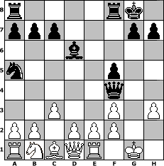 game notation in PGN-format [Event "Carpe Diem 2"] [Site "www.myChess.de"] [Date "2007.08.11"] [Round "1"] [White "Jens1943"] [Black "kambo"] [ECO "C44"] [WhitemyELO "1325"] [BlackmyELO "1191"] [Result "0-1"] [TimeControl "10/1728000"] [WhiteDays "37"] [BlackDays "40"] [MyChessNo "37239"] 1. e4 e5 2. Nf3 Nc6 3. c3 Nf6 4. Bc4 Na5 5. Bd3 d5 6. Nxe5 Nxe4 7. O-O Bd6 8. Nf3 Bg4 9. Re1 O-O 10. Bxe4 dxe4 11. Rxe4 Bxf3 12. gxf3 f5 13. Re1 Qh4 14. h3 Qf4 0-1 position notation in FEN-format r4rk1/ppp3pp/3b4/n4p2/5q2/2P2P1P/PP1PPP2/RNBQR1K1 - - - 1 15 Captured white pieces: ![]() ![]() ![]() ![]() ![]() ![]() ![]() ![]() ![]() ![]() ![]() ![]() ![]() ![]() ![]() Captured black pieces: ![]() ![]() ![]() ![]() ![]() ![]() ![]() ![]() ![]() ![]() ![]() ![]() ![]() ![]() ![]() Click on a captured piece in order to display the desired move!