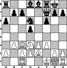 game notation in PGN-format [Event "T960-S07"] [Site "www.myChess.de"] [Date "2009.06.21"] [Round "1"] [White "dschneid@"] [Black "Klothos@"] [Variant "Fischerrandom"] [SetUp "1"] [FEN "rnnbbkqr/pppppppp/8/8/8/8/PPPPPPPP/RNNBBKQR w KQkq - 0 1"] [WhitemyELO "1500"] [BlackmyELO "1500"] [Result "0-1"] [TimeControl "10/3456000"] [WhiteDays "00"] [BlackDays "74"] [MyChessNo "56767"] 1. d4 f6 2. Nd3 Nc6 3. e3 d5 4. Na3 a6 5. Rc1 Nd6 6. Bg4 e5 7. dxe5 Nxe5 8. Be2 Qf7 9. Bc3 Nec4 10. Nxc4 Nxc4 11. b3 Nd6 12. f3 O-O 0-1 position notation in FEN-format r2bbrk1/1pp2qpp/p2n1p2/3p4/8/1PBNPP2/P1PPB1PP/2R2KQR - K - 1 13 Captured white pieces: Captured black pieces: Click on a captured piece in order to display the desired move!