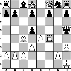 game notation in PGN-format [Event "Neue Reihe: sch"] [Site "www.myChess.de"] [Date "2009.11.16"] [Round "1"] [White "HenrySchinasky"] [Black "deepsabel"] [ECO "C25"] [WhitemyELO "2120"] [BlackmyELO "1956"] [Result "1/2-1/2"] [TimeControl "10/2592000"] [WhiteDays "28"] [BlackDays "30"] [MyChessNo "60711"] 1. e4 e5 2. Nc3 Nc6 3. f4 exf4 4. Nf3 g5 5. Bc4 g4 6. O-O gxf3 7. Qxf3 Bc5+ 8. Kh1 Qh4 9. Nd5 Ne5 10. Qe2 Ng4 11. h3 Nf2+ 12. Rxf2 Bxf2 13. d3 Kd8 14. Bxf4 Bg3 15. Rf1 c6 16. Qe3 Bxf4 17. Rxf4 Qh5 18. Qc5 cxd5 19. Qf8+ 1/2-1/2 position notation in FEN-format r1bk1Qnr/pp1p1p1p/8/3p3q/2B1PR2/3P3P/PPP3P1/7K - - - 1 19 Captured white pieces: ![]() ![]() ![]() ![]() ![]() ![]() ![]() ![]() ![]() ![]() ![]() ![]() ![]() ![]() ![]() Captured black pieces: ![]() ![]() ![]() ![]() ![]() ![]() ![]() ![]() ![]() ![]() ![]() ![]() ![]() ![]() ![]() Click on a captured piece in order to display the desired move!