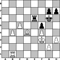 game notation in PGN-format [Event "Najdorf mit f4"] [Site "www.myChess.de"] [Date "2022.02.01"] [Round "1"] [White "kalle"] [Black "Lohl"] [ECO "B93"] [WhitemyELO "1570"] [BlackmyELO "1712"] [Result "1-0"] [TimeControl "10/2592000"] [WhiteDays "118"] [BlackDays "120"] [MyChessNo "124501"] 1. e4 c5 2. Nf3 d6 3. d4 cxd4 4. Nxd4 Nf6 5. Nc3 a6 6. f4 Nbd7 7. Bc4 e5 8. Nf5 b5 9. Bb3 Qb6 10. Be3 Nc5 11. Nd5 Nxd5 12. Qxd5 Qb7 13. Nxd6+ Bxd6 14. Qxd6 Nxb3 15. Qxe5+ Qe7 16. Qxe7+ Kxe7 17. axb3 Rd8 18. h3 Bb7 19. Kf2 Bxe4 20. c4 bxc4 21. bxc4 Rab8 22. Bc5+ Kf6 23. b4 Rd2+ 24. Ke3 Rbd8 25. Kxe4 Re2+ 26. Kf3 Rde8 27. Rxa6+ R8e6 28. Rxe6+ Rxe6 29. Bd4+ Kg6 30. Rb1 f5 31. c5 1-0 position notation in FEN-format 8/6pp/4r1k1/2P2p2/1P1B1P2/5K1P/6P1/1R6 - - - 0 31 Captured white pieces: Captured black pieces: Click on a captured piece in order to display the desired move!