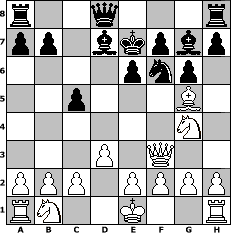game notation in PGN-format [Event "2er Mannschaftsturnier"] [Site "www.myChess.de"] [Date "2006.11.10"] [Round "1"] [Board "1"] [White "kischok46"] [Black "Chelly"] [ECO "B50"] [WhitemyELO "1632"] [BlackmyELO "1694"] [Result "1-0"] [TimeControl "10/1728000"] [WhiteDays "40"] [BlackDays "37"] [MyChessNo "29901"] 1. e4 c5 2. Nf3 d6 3. Bc4 Nf6 4. d3 g6 5. e5 dxe5 6. Nxe5 e6 7. Qf3 Nbd7 8. Bb5 Bg7 9. Bg5 Ke7 10. Bxd7 Bxd7 11. Ng4 1-0 position notation in FEN-format r2q3r/pp1bkpbp/4pnp1/2p3B1/6N1/3P1Q2/PPP1PPPP/RN2K2R - KQ - 1 11 Captured white pieces: Captured black pieces: Click on a captured piece in order to display the desired move!