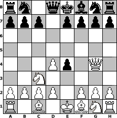 game notation in PGN-format [Event "BDG 2"] [Site "www.myChess.de"] [Date "2015.01.11"] [Round "1"] [White "Seneca"] [Black "MiFie"] [ECO "D00"] [WhitemyELO "1563"] [BlackmyELO "1059"] [Result "1-0"] [TimeControl "10/2592000"] [WhiteDays "29"] [BlackDays "29"] [MyChessNo "97612"] 1. d4 d5 2. e4 dxe4 3. Nc3 Bg4 4. Qxg4 1-0 position notation in FEN-format rn1qkbnr/ppp1pppp/8/8/3Pp1Q1/2N5/PPPP1PPP/R1B1KBNR - KQkq - 0 4 Captured white pieces: Captured black pieces: Click on a captured piece in order to display the desired move!
