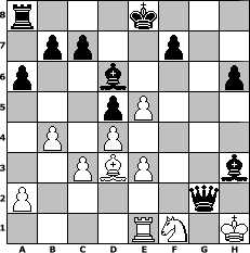 game notation in PGN-format [Event "In Memorium Michael Knopf"] [Site "www.myChess.de"] [Date "2012.04.10"] [Round "1"] [White "Achimkogge"] [Black "rikilatic"] [ECO "D02"] [WhitemyELO "1421"] [BlackmyELO "1415"] [Result "0-1"] [TimeControl "10/2592000"] [WhiteDays "82"] [BlackDays "82"] [MyChessNo "81065"] 1. d4 d5 2. Nf3 e6 3. c3 h6 4. Bf4 Nc6 5. Nbd2 g5 6. Bg3 Bg7 7. e3 a6 8. Bd3 Nf6 9. h3 Nh5 10. Bh2 Nf6 11. O-O g4 12. Ne5 gxh3 13. gxh3 Nxe5 14. Bxe5 Rg8 15. f3 Nh5 16. f4 Bxe5+ 17. Kh2 Qh4 18. Rg1 Qf2+ 19. Kh1 Rxg1+ 20. Qxg1 Ng3+ 21. Qxg3 Qxg3 22. Nf1 Qf3+ 23. Kh2 Bd6 24. b4 e5 25. Re1 Qf2+ 26. Kh1 Bxh3 27. fxe5 Qg2# 0-1 position notation in FEN-format r3k3/1pp2p2/p2b3p/3pP3/1P1P4/2PBP2b/P5q1/4RN1K - q - 1 28 Captured white pieces: ![]() ![]() ![]() ![]() ![]() ![]() ![]() ![]() ![]() ![]() ![]() ![]() ![]() ![]() ![]() Captured black pieces: ![]() ![]() ![]() ![]() ![]() ![]() ![]() ![]() ![]() ![]() ![]() ![]() ![]() ![]() ![]() Click on a captured piece in order to display the desired move!