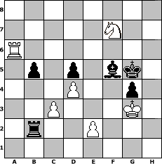 game notation in PGN-format [Event "Unter uns Nr. 8"] [Site "www.myChess.de"] [Date "2013.03.03"] [Round "1"] [White "alpacino"] [Black "reisinger"] [ECO "C00"] [WhitemyELO "1354"] [BlackmyELO "1494"] [Result "1-0"] [TimeControl "10/864000"] [WhiteDays "59"] [BlackDays "60"] [MyChessNo "86934"] 1. e4 e6 2. Nc3 d5 3. d4 Bb4 4. e5 Ne7 5. Bd2 a6 6. a3 Bxc3 7. Bxc3 Nbc6 8. Bd3 Nf5 9. Bxf5 exf5 10. Nf3 O-O 11. O-O Be6 12. Bd2 Re8 13. c3 h6 14. Re1 Na5 15. b3 b5 16. b4 Nc4 17. Qc1 a5 18. bxa5 Rxa5 19. h3 Qe7 20. Qb1 Rea8 21. Bf4 Nxa3 22. Qc1 Nc4 23. Rxa5 Rxa5 24. Kh1 Ra2 25. Kg1 c6 26. Qb1 Rb2 27. Qa1 Qa3 28. Qxa3 Nxa3 29. Bc1 Rb3 30. Bxa3 Rxa3 31. Rc1 g5 32. Kf1 Ra2 33. Ke1 Kg7 34. g3 f6 35. Kf1 g4 36. hxg4 fxg4 37. exf6+ Kxf6 38. Ne5 Ra6 39. Nd3 Bf5 40. Nc5 Ra8 41. Kg1 h5 42. Kh2 Be4 43. Nd7+ Kg5 44. Ne5 h4 45. Nf7+ Kf6 46. Ne5 hxg3+ 47. Kxg3 Bf5 48. Nxc6 Rh8 49. Kf4 Rh3 50. Ne5 Rh2 51. Ra1 Rxf2+ 52. Kg3 Rc2 53. Ra3 Rb2 54. Ra6+ Kg5 55. Nf7+ 1-0 position notation in FEN-format 8/5N2/R7/1p1p1bk1/3P2p1/2P3K1/1r2P3/8 - - - 7 55 Captured white pieces: Captured black pieces: Click on a captured piece in order to display the desired move!