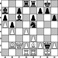 game notation in PGN-format [Event "Zwischendurch mal ein paar eigene Z"] [Site "www.myChess.de"] [Date "2009.06.25"] [Round "1"] [White "wiesel"] [Black "Matti"] [ECO "D00"] [WhitemyELO "1384"] [BlackmyELO "1465"] [Result "0-1"] [TimeControl "10/1728000"] [WhiteDays "50"] [BlackDays "60"] [MyChessNo "56953"] 1. d4 d5 2. e3 a6 3. Nc3 Nf6 4. Bd3 e6 5. Nf3 Bb4 6. O-O O-O 7. a3 Ba5 8. b4 Bb6 9. Ne2 Bd7 10. a4 h6 11. c3 Nc6 12. a5 Ba7 13. Nf4 Re8 14. Qc2 Rc8 15. Nh5 Nxh5 16. Bh7+ Kh8 17. Bd3 Nf6 18. Re1 Kg8 19. Ba3 b5 20. Ne5 Nxe5 21. dxe5 Ng4 22. Be2 Nxe5 23. Bh5 Bc6 24. Bb2 Qg5 25. Be2 Rcd8 26. Rad1 d4 27. cxd4 Qxg2# 0-1 position notation in FEN-format 3rr1k1/b1p2pp1/p1b1p2p/Pp2n3/1P1P4/4P3/1BQPBPqP/3RR1K1 - - - 0 28 Captured white pieces: Captured black pieces: Click on a captured piece in order to display the desired move!