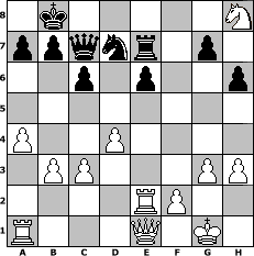 game notation in PGN-format [Event "Zum Vatertag"] [Site "www.myChess.de"] [Date "2017.05.27"] [Round "1"] [White "Ziegert"] [Black "Joschi"] [ECO "B17"] [WhitemyELO "1582"] [BlackmyELO "1541"] [Result "1-0"] [TimeControl "10/2592000"] [WhiteDays "20"] [BlackDays "90"] [MyChessNo "108351"] 1. e4 c6 2. d4 d5 3. Nc3 dxe4 4. Nxe4 Nd7 5. Nf3 Ngf6 6. Nxf6+ Nxf6 7. Bd3 Bg4 8. c3 e6 9. h3 Bh5 10. O-O Be7 11. Be2 Qc7 12. Re1 O-O-O 13. a4 h6 14. Ne5 Bxe2 15. Rxe2 Bd6 16. Qe1 Rdf8 17. b3 Nd7 18. Nc4 Bf4 19. Ba3 Re8 20. g3 Bg5 21. Nd6+ Kb8 22. Nxf7 Be7 23. Bxe7 Rxe7 24. Nxh8 1-0 position notation in FEN-format 1k5N/ppqnr1p1/2p1p2p/8/P2P4/1PP3PP/4RP2/R3Q1K1 - - - 0 24 Captured white pieces: Captured black pieces: Click on a captured piece in order to display the desired move!