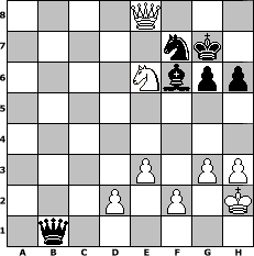 game notation in PGN-format [Event "Katalanische Verteidigung"] [Site "www.myChess.de"] [Date "2015.02.07"] [Round "1"] [White "Knight"] [Black "sprinterde"] [ECO "E00"] [WhitemyELO "1258"] [BlackmyELO "1729"] [Result "1-0"] [TimeControl "10/2592000"] [WhiteDays "120"] [BlackDays "120"] [MyChessNo "98010"] 1. d4 Nf6 2. c4 e6 3. g3 d5 4. Bg5 Be7 5. Nf3 h6 6. Bxf6 Bxf6 7. Nc3 Nc6 8. cxd5 exd5 9. Bg2 O-O 10. O-O Be6 11. e3 a6 12. a3 Rb8 13. Re1 b5 14. b4 a5 15. Qb1 axb4 16. axb4 Qd6 17. Ra6 Bc8 18. Ra2 Nxb4 19. Rb2 c5 20. Rc1 cxd4 21. Nxd4 Na6 22. Ndxb5 Qd7 23. h3 Bb7 24. Rd1 Bc6 25. Nd4 Ba8 26. Rxb8 Rxb8 27. Qa2 Nb4 28. Qa3 Qc8 29. Rb1 Nd3 30. Rxb8 Qxb8 31. Nxd5 Bxd5 32. Bxd5 Qb1+ 33. Kh2 g6 34. Qa8+ Kg7 35. Qe8 Ne5 36. Bxf7 Nxf7 37. Ne6+ 1-0 position notation in FEN-format 4Q3/5nk1/4Nbpp/8/8/4P1PP/3P1P1K/1q6 - - - 1 37 Captured white pieces: Captured black pieces: Click on a captured piece in order to display the desired move!
