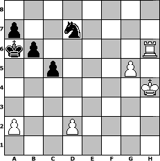 game notation in PGN-format [Event "Die Eisenbahner sind wieder da!!"] [Site "www.myChess.de"] [Date "2016.09.09"] [Round "1"] [White "Erich"] [Black "muetoe"] [Variant "Fischerrandom"] [SetUp "1"] [FEN "bnnrqbkr/pppppppp/8/8/8/8/PPPPPPPP/BNNRQBKR w KQkq - 0 1"] [WhitemyELO "2117"] [BlackmyELO "1966"] [Result "1-0"] [TimeControl "10/1728000"] [WhiteDays "100"] [BlackDays "061"] [MyChessNo "104854"] 1. e4 e5 2. Nc3 Nc6 3. Bd3 Bd6 4. N3e2 Qe6 5. c3 Be7 6. Ng3 h5 7. h4 Nb6 8. b4 Bf6 9. Bc2 d5 10. Nb3 g6 11. exd5 Nxd5 12. b5 Nce7 13. Nc5 Qg4 14. f3 Qf4 15. Nge4 Bg7 16. Nd3 Qf5 17. c4 Nb6 18. Nxe5 Bxe5 19. Nf2 Qxc2 20. Qxe5 O-O-O 21. Qxe7 Rhe8 22. Qxf7 Nxc4 23. Kh2 Nd6 24. Qf4 Nxb5 25. Bf6 Rd5 26. Rhe1 Rxe1 27. Rxe1 b6 28. Re8+ Kb7 29. Ne4 Qc6 30. Rg8 Rf5 31. Qe3 Rxf6 32. Nxf6 Qd6+ 33. Kh3 Qxf6 34. Qe4+ c6 35. Qxg6 Qe5 36. Qg7+ Qxg7 37. Rxg7+ Ka6 38. g4 hxg4+ 39. fxg4 c5 40. h5 Be4 41. h6 Nd4 42. h7 Bxh7 43. Rxh7 Ne6 44. Kh4 Nf8 45. Rh6 Nd7 46. g5 1-0 position notation in FEN-format 8/p2n4/kp5R/2p3P1/7K/8/P2P4/8 - - - 0 46 Captured white pieces: Captured black pieces: Click on a captured piece in order to display the desired move!