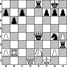 | game notation in PGN-format [Event "Zug um Zug gegen Fr"] [Site "www.myChess.de"] [Date "2010.05.04"] [Round "1"] [White "BobbyF4"] [Black "Caligula"] [ECO "A00"] [WhitemyELO "1521"] [BlackmyELO "1360"] [Result "0-1"] [TimeControl "10/2592000"] [WhiteDays "71"] [BlackDays "90"] [MyChessNo "65350"] 1. a4 e5 2. c4 d5 3. cxd5 Nf6 4. Nc3 Bb4 5. Qb3 Bxc3 6. bxc3 Qxd5 7. c4 Qc6 8. Ba3 Be6 9. d3 Nbd7 10. Rb1 b6 11. e3 Nc5 12. Bxc5 Qxc5 13. Nf3 O-O 14. Ng5 Bd7 15. d4 exd4 16. h4 dxe3 17. fxe3 Rfe8 18. Be2 Rxe3 19. Qd1 Rae8 20. Rb2 Bg4 21. Nf3 Qxc4 22. Ng1 Qe4 23. Kf1 Bxe2+ 24. Nxe2 Ng4 25. Rh3 Rxh3 0-1 position notation in FEN-format 4r1k1/p1p2ppp/1p6/8/P3q1nP/7r/PR2N1P1/3Q1K2 - - - 0 26 Captured white pieces:                              Captured black pieces:                               Click on a captured piece in order to display the desired move!