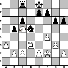 game notation in PGN-format [Event "7. Frankenwaldturnier"] [Site "www.myChess.de"] [Date "2008.07.18"] [Round "1"] [White "werderfan"] [Black "brucybabe"] [ECO "B32"] [WhitemyELO "1545"] [BlackmyELO "1676"] [Result "1/2-1/2"] [TimeControl "10/864000"] [WhiteDays "30"] [BlackDays "24"] [MyChessNo "46394"] 1. e4 c5 2. Nf3 Nc6 3. d4 cxd4 4. Nxd4 d6 5. Nxc6 bxc6 6. Bc4 Nf6 7. Nc3 g6 8. Qf3 Qc7 9. O-O Bg7 10. Bf4 O-O 11. Rfe1 Bg4 12. Qd3 Rad8 13. f3 Bc8 14. Rad1 Rfe8 15. Qe3 Qb6 16. Qxb6 axb6 17. e5 dxe5 18. Bxe5 Rxd1 19. Rxd1 Bf5 20. Bd3 Bxd3 21. Rxd3 Kf8 22. Na4 b5 23. Nc5 Nd5 24. Bxg7+ Kxg7 25. a3 Rc8 26. Kf2 Kf8 27. g3 h6 28. f4 Ke8 1/2-1/2 position notation in FEN-format 2r1k3/4pp2/2p3pp/1pNn4/5P2/P2R2P1/1PP1PK1P/8 - - - 1 29 Captured white pieces: Captured black pieces: Click on a captured piece in order to display the desired move!