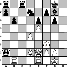 game notation in PGN-format [Event "fr"] [Site "www.myChess.de"] [Date "2011.10.14"] [Round "1"] [White "retep1"] [Black "Fedkopv"] [ECO "A48"] [WhitemyELO "1735"] [BlackmyELO "2035"] [Result "1/2-1/2"] [TimeControl "10/1728000"] [WhiteDays "20"] [BlackDays "20"] [MyChessNo "76835"] 1. d4 Nf6 2. Nf3 g6 3. c4 Bg7 4. Nc3 d5 5. cxd5 Nxd5 6. e4 Nxc3 7. bxc3 c5 8. Rb1 O-O 9. Be2 b6 10. O-O Qc7 11. Qd3 Ba6 12. Qe3 Bxe2 13. Qxe2 e6 14. Bd2 Qc6 15. Rfe1 Nd7 16. h4 Qa4 17. h5 cxd4 18. cxd4 Rfc8 19. hxg6 hxg6 20. e5 Qxa2 1/2-1/2 position notation in FEN-format r1r3k1/p2n1pb1/1p2p1p1/4P3/3P4/5N2/q2BQPP1/1R2R1K1 - - - 0 21 Captured white pieces: Captured black pieces: Click on a captured piece in order to display the desired move!