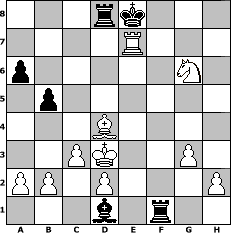 game notation in PGN-format [Event "Krampusturnier"] [Site "www.myChess.de"] [Date "2012.11.25"] [Round "1"] [White "Knight"] [Black "MiFie"] [ECO "A40"] [WhitemyELO "1172"] [BlackmyELO "1088"] [Result "1-0"] [TimeControl "10/1728000"] [WhiteDays "20"] [BlackDays "17"] [MyChessNo "85149"] 1. d4 c6 2. e4 d5 3. Nc3 dxe4 4. Nxe4 Nf6 5. Nxf6+ gxf6 6. Nf3 e5 7. Be3 Bb4+ 8. c3 Bd6 9. dxe5 fxe5 10. Bc4 b5 11. Bxf7+ Kxf7 12. Ng5+ Kg6 13. Qd3+ Kg7 14. O-O-O h6 15. Nf3 Re8 16. Qxd6 Qxd6 17. Rxd6 Nd7 18. Nh4 Rf8 19. Rg6+ Kh7 20. Rxh6+ Kg7 21. Rd1 Nf6 22. f4 Kxh6 23. fxe5+ Kh5 24. exf6 Rxf6 25. Bd4 Rf4 26. g3 Bg4 27. Re1 Rf7 28. Re5+ Kh6 29. Be3+ Kh7 30. Rg5 Rf1+ 31. Kc2 Bd1+ 32. Kd3 Rd8+ 33. Bd4 c5 34. Rxc5 a6 35. Rc7+ Kg8 36. Rg7+ Kf8 37. Ng6+ Ke8 38. Re7# 1-0 position notation in FEN-format 3rk3/4R3/p5N1/1p6/3B4/2PK2P1/PP1P3P/3b1r2 - - - 7 38 Captured white pieces: Captured black pieces: Click on a captured piece in order to display the desired move!