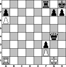 game notation in PGN-format [Event "Bobby Fischer Ged"] [Site "www.myChess.de"] [Date "2008.02.01"] [Round "1"] [White "Ostseeboy"] [Black "BobbyF4"] [ECO "A00"] [WhitemyELO "1311"] [BlackmyELO "1591"] [Result "0-1"] [TimeControl "10/864000"] [WhiteDays "38"] [BlackDays "35"] [MyChessNo "42165"] 1. b4 e5 2. Bb2 f6 3. a3 d5 4. Nf3 Be6 5. e3 Bd6 6. Be2 Ne7 7. O-O O-O 8. d3 b6 9. c4 c5 10. cxd5 Nxd5 11. bxc5 bxc5 12. Nc3 Nxc3 13. Bxc3 Nd7 14. d4 cxd4 15. exd4 e4 16. Nd2 f5 17. Bc4 Bxc4 18. Nxc4 Bf4 19. g3 Bc7 20. Qb3 Kh8 21. d5 Rb8 22. d6 Rxb3 23. Rfc1 Bb6 24. Nxb6 Qxb6 25. a4 Qxd6 26. a5 Rxc3 27. Rxc3 Ne5 28. Rb3 Nf3+ 29. Kg2 Qh6 30. h4 f4 31. Rb4 Nxh4+ 32. gxh4 Qxh4 33. Rxe4 f3+ 34. Kg1 Qxe4 35. a6 Qg4+ 0-1 position notation in FEN-format 5r1k/p5pp/P7/8/6q1/5p2/5P2/R5K1 - - - 1 36 Captured white pieces: Captured black pieces: Click on a captured piece in order to display the desired move!