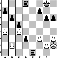 game notation in PGN-format [Event "In Memorium Michael Knopf"] [Site "www.myChess.de"] [Date "2012.04.10"] [Round "1"] [White "augustus"] [Black "Sanji"] [ECO "B20"] [WhitemyELO "1299"] [BlackmyELO "1616"] [Result "0-1"] [TimeControl "10/2592000"] [WhiteDays "092"] [BlackDays "118"] [MyChessNo "81108"] 1. e4 c5 2. Bc4 Nc6 3. c3 Nf6 4. Nf3 Nxe4 5. O-O g6 6. d3 Nd6 7. Bg5 Bg7 8. Re1 O-O 9. Nbd2 Nxc4 10. Nxc4 d5 11. Ncd2 h6 12. Bh4 Bf6 13. Bg3 Bg4 14. Qc2 Rc8 15. a3 d4 16. c4 Re8 17. Re4 Bf5 18. Re2 e5 19. a4 Nb4 20. Qd1 Nxd3 21. Qb3 b6 22. h3 Qd7 23. Ne4 Bxe4 24. Rxe4 Nb4 25. Qa3 Nc2 26. Qa2 Nxa1 27. Qxa1 Qf5 28. Qe1 Rcd8 29. Bxe5 Bxe5 30. Nh4 Qxe4 31. Nf3 Qxe1+ 32. Nxe1 Bh2+ 33. Kxh2 Rxe1 34. f3 d3 0-1 position notation in FEN-format 3r2k1/p4p2/1p4pp/2p5/P1P5/3p1P1P/1P4PK/4r3 - - - 0 35 Captured white pieces: Captured black pieces: Click on a captured piece in order to display the desired move!