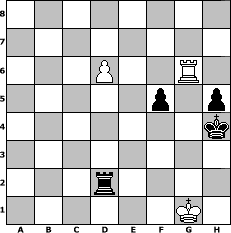 game notation in PGN-format [Event "Winterspiele"] [Site "www.myChess.de"] [Date "2008.12.29"] [Round "1"] [White "nogumo"] [Black "Juliette2103"] [ECO "A00"] [WhitemyELO "1579"] [BlackmyELO "1461"] [Result "1/2-1/2"] [TimeControl "10/864000"] [WhiteDays "13"] [BlackDays "10"] [MyChessNo "51125"] 1. b4 c6 2. c4 Nf6 3. Bb2 g6 4. e3 Bg7 5. Nf3 O-O 6. Nc3 a5 7. b5 d5 8. a4 Bg4 9. cxd5 Nxd5 10. d4 Nxc3 11. Bxc3 cxb5 12. Bxb5 Nc6 13. h3 Bxf3 14. Qxf3 Rc8 15. O-O e6 16. Rac1 Qf6 17. Qe4 Qf5 18. Bxc6 Rxc6 19. Qxf5 gxf5 20. Bxa5 Rxc1 21. Rxc1 Ra8 22. Bb4 h6 23. a5 Bf8 24. Bxf8 Kxf8 25. Rc7 Rxa5 26. Rxb7 Ra1+ 27. Kh2 Ra2 28. Kg3 Kg7 29. h4 Kg6 30. f4 h5 31. Kf3 Rc2 32. Rb6 Rd2 33. g3 Kf6 34. Rb3 Ke7 35. Rb1 Rd3 36. Ke2 Ra3 37. Rd1 Kd6 38. Rb1 Kd5 39. Rb7 Ke4 40. Rxf7 Ra2+ 41. Kf1 Kf3 42. Kg1 Kxg3 43. Rg7+ Kf3 44. Rg6 Kxe3 45. Rxe6+ Kxf4 46. d5 Kg3 47. Rg6+ Kxh4 48. d6 Rd2 1/2-1/2 position notation in FEN-format 8/8/3P2R1/5p1p/7k/8/3r4/6K1 - - - 1 49 Captured white pieces: Captured black pieces: Click on a captured piece in order to display the desired move!