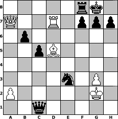 game notation in PGN-format [Event "Weihnachtstunier"] [Site "www.myChess.de"] [Date "2005.12.14"] [Round "1"] [White "nogumo"] [Black "otto01"] [ECO "A00"] [WhitemyELO "1893"] [BlackmyELO "2132"] [Result "0-1"] [TimeControl "10/864000"] [WhiteDays "10"] [BlackDays "10"] [MyChessNo "20752"] 1. b4 e5 2. Bb2 Bxb4 3. Bxe5 Nf6 4. Nc3 O-O 5. Bxf6 Qxf6 6. Nd5 Qd4 7. Nxb4 Qxb4 8. e3 d6 9. Nf3 Nd7 10. Be2 Nf6 11. O-O Qg4 12. Rb1 c5 13. d4 b6 14. dxc5 dxc5 15. Ne5 Qe6 16. Bf3 Ba6 17. Bxa8 Bxf1 18. Kxf1 Qxe5 19. Bf3 Qxh2 20. g3 Qh3+ 21. Bg2 Qc8 22. c4 Qe6 23. Qd3 Re8 24. Rd1 Ng4 25. Qd7 Qxc4+ 26. Kg1 Rf8 27. Qxa7 Nxf2 28. Rd7 Ng4 29. Bd5 Qc1+ 30. Kg2 Nxe3+ 0-1 position notation in FEN-format 5rk1/Q2R1ppp/1p6/2pB4/8/4n1P1/P5K1/2q5 - - - 0 31 Captured white pieces: Captured black pieces: Click on a captured piece in order to display the desired move!