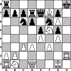 game notation in PGN-format [Event "Neues Jahr neue Er"] [Site "www.myChess.de"] [Date "2017.01.06"] [Round "1"] [White "Master1"] [Black "Knight"] [ECO "A00"] [WhitemyELO "1311"] [BlackmyELO "1200"] [Result "1-0"] [TimeControl "10/2592000"] [WhiteDays "84"] [BlackDays "89"] [MyChessNo "106373"] 1. Nc3 e5 2. e4 Nf6 3. Nf3 Nc6 4. Bc4 Bc5 5. Ng5 O-O 6. d3 d6 7. Nd5 Bg4 8. f3 Bh5 9. Be3 Bxe3 10. Nxe3 Nd4 11. O-O Re8 12. c3 Nc6 13. g4 Bg6 14. h4 h6 15. h5 hxg5 16. hxg6 Re7 17. Nf5 Rd7 18. Bxf7+ Kh8 19. Rf2 Qe7 20. Rh2+ 1-0 position notation in FEN-format r6k/ppprqBp1/2np1nP1/4pNp1/4P1P1/2PP1P2/PP5R/RN1Q2K1 - - - 4 20 Captured white pieces: Captured black pieces: Click on a captured piece in order to display the desired move!