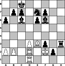 game notation in PGN-format [Event "Vereinsmeisterschaft"] [Site "www.myChess.de"] [Date "2006.08.24"] [Round "1"] [White "Jens1943"] [Black "BirdofPray1"] [ECO "B01"] [WhitemyELO "1453"] [BlackmyELO "2115"] [Result "0-1"] [TimeControl "10/2592000"] [WhiteDays "115"] [BlackDays "069"] [MyChessNo "27956"] 1. e4 d5 2. exd5 Qxd5 3. Nf3 Bf5 4. Nc3 Qe6+ 5. Be2 Nc6 6. O-O O-O-O 7. Re1 Qf6 8. d3 h6 9. Be3 e6 10. Nb5 a6 11. Nc3 Nge7 12. d4 g5 13. Qc1 g4 14. Ne5 Nxe5 15. dxe5 Qxe5 16. Bf4 Qc5 17. Be3 Qc6 18. Rd1 Bg7 19. Re1 h5 20. Rd1 h4 21. Bd3 Rxd3 22. cxd3 h3 23. f3 gxf3 24. Rd2 hxg2 25. Ne4 Bxe4 26. h4 Rxh4 27. Kf2 Rh3 28. Qxc6 Bxc6 29. Rad1 Bf6 0-1 position notation in FEN-format 2k5/1pp1np2/p1b1pb2/8/8/3PBp1r/PP1R1Kp1/3R4 - - - 2 30 Captured white pieces: Captured black pieces: Click on a captured piece in order to display the desired move!