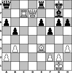 game notation in PGN-format [Event "wie w"] [Site "www.myChess.de"] [Date "2013.11.16"] [Round "1"] [White "reisinger"] [Black "Joschi"] [ECO "A56"] [WhitemyELO "1507"] [BlackmyELO "1574"] [Result "1-0"] [TimeControl "10/1728000"] [WhiteDays "20"] [BlackDays "20"] [MyChessNo "91166"] 1. d4 Nf6 2. c4 c5 3. e3 cxd4 4. exd4 d5 5. Nc3 e6 6. Bf4 Be7 7. Be2 dxc4 8. Bxc4 a6 9. Nf3 b5 10. Bb3 Bb7 11. O-O O-O 12. Re1 Nbd7 13. Ne5 Nb6 14. Re3 Nbd5 15. Nxd5 Nxd5 16. Bxd5 Qxd5 17. Nf3 Rad8 18. Re5 Qd7 19. Be3 g6 20. Bh6 Rfe8 21. h3 Bf6 22. Rc5 Bxf3 23. Qxf3 Bxd4 24. Rc2 Bg7 25. Bg5 Rc8 26. Rd1 Qa7 27. Rcd2 Qb8 28. b3 h6 29. Be3 Rcd8 30. Rd7 Rxd7 31. Rxd7 f5 32. Qc6 Qc8 33. Rc7 Qa8 34. Qd7 1-0 position notation in FEN-format q3r1k1/2RQ2b1/p3p1pp/1p3p2/8/1P2B2P/P4PP1/6K1 - - - 5 34 Captured white pieces: Captured black pieces: Click on a captured piece in order to display the desired move!