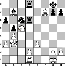 game notation in PGN-format [Event "Fr"] [Site "www.myChess.de"] [Date "2017.02.25"] [Round "1"] [White "Naunhofer"] [Black "Joschi"] [ECO "A56"] [WhitemyELO "1631"] [BlackmyELO "1567"] [Result "1-0"] [TimeControl "10/2592000"] [WhiteDays "90"] [BlackDays "90"] [MyChessNo "107127"] 1. d4 Nf6 2. c4 c5 3. e3 cxd4 4. exd4 d5 5. Nc3 e6 6. Nf3 dxc4 7. Bxc4 Nc6 8. O-O Be7 9. Bf4 a6 10. a3 O-O 11. b4 b5 12. Be2 Bb7 13. Be3 Rc8 14. Qb3 Ng4 15. Rad1 Nxe3 16. fxe3 Bg5 17. Nxg5 Qxg5 18. Ne4 Qe7 19. Nc5 Rfd8 20. Bf3 Rd6 21. d5 exd5 22. Bxd5 Rcd8 23. Rxf7 Qxf7 24. Bxf7+ 1-0 position notation in FEN-format 3r2k1/1b3Bpp/p1nr4/1pN5/1P6/PQ2P3/3P2PP/3R2K1 - - - 0 24 Captured white pieces: Captured black pieces: Click on a captured piece in order to display the desired move!