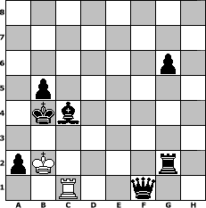 game notation in PGN-format [Event "unter uns Nr. 30 (Weihnachtsturnier)"] [Site "www.myChess.de"] [Date "2015.12.21"] [Round "1"] [White "Achimkogge"] [Black "Master1"] [ECO "A45"] [WhitemyELO "1493"] [BlackmyELO "1260"] [Result "0-1"] [TimeControl "10/2592000"] [WhiteDays "121"] [BlackDays "183"] [MyChessNo "101749"] 1. d4 Nf6 2. d5 Nxd5 3. Qxd5 e6 4. Qd1 d5 5. Nf3 Nc6 6. Bf4 Bd6 7. Bxd6 Qxd6 8. c3 O-O 9. e3 e5 10. Bd3 e4 11. Bxe4 dxe4 12. Nd4 Nxd4 13. Qxd4 Qxd4 14. cxd4 Bf5 15. O-O Rac8 16. Nc3 c5 17. d5 a6 18. h3 b5 19. g4 Bd7 20. Nxe4 f5 21. Nd6 Rc7 22. g5 Ra7 23. f4 h6 24. Rac1 c4 25. a3 a5 26. h4 hxg5 27. hxg5 g6 28. Kf2 Ra6 29. Nb7 Bc8 30. Nc5 Rd6 31. Rcd1 Rfd8 32. Rd4 Rxd5 33. Rd1 Rxd4 34. exd4 Kf7 35. d5 Ke7 36. Ke3 Kd6 37. Kd4 Rh8 38. Re1 Rh2 39. Ne6 Rxb2 40. Nc5 Rd2+ 41. Kc3 Rxd5 42. Nb3 cxb3 43. Kxb3 Be6 44. Kc3 Rc5+ 45. Kb2 Rc4 46. Rd1+ Kc5 47. Re1 Re4 48. Rc1+ Bc4 49. Kc3 Rxf4 50. Re1 Rf3+ 51. Kb2 Rb3+ 52. Kc2 Rxa3 53. Re5+ Kd6 54. Re1 Rg3 55. Rd1+ Kc5 56. Rd8 Rxg5 57. Rc8+ Kb4 58. Rf8 Rg4 59. Rd8 a4 60. Rd2 a3 61. Rh2 a2 62. Kb2 f4 63. Rh1 f3 64. Rc1 Rg2+ 65. Ka1 f2 66. Kb2 f1=Q+ 0-1 position notation in FEN-format 8/8/6p1/1p6/1kb5/8/pK4r1/2R2q2 - - - 0 67 Captured white pieces: Captured black pieces: Click on a captured piece in order to display the desired move!