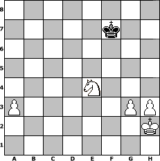 game notation in PGN-format [Event "Schach im Fr"] [Site "www.myChess.de"] [Date "2009.04.06"] [Round "1"] [White "Master1"] [Black "beowulf"] [ECO "D10"] [WhitemyELO "1386"] [BlackmyELO "1358"] [Result "1-0"] [TimeControl "10/864000"] [WhiteDays "10"] [BlackDays "10"] [MyChessNo "54582"] 1. d4 d5 2. c4 c6 3. cxd5 cxd5 4. Nf3 Nf6 5. Nc3 Nc6 6. e3 Bg4 7. Be2 e6 8. O-O Bb4 9. h3 Bxf3 10. Bxf3 O-O 11. Bd2 Re8 12. a3 Ba5 13. b4 Bb6 14. b5 Na5 15. e4 Nc4 16. e5 Nd7 17. Ne2 a6 18. bxa6 Rxa6 19. Bc1 h6 20. Nc3 Qe7 21. Be2 Rea8 22. Bxc4 dxc4 23. Nb5 Nb8 24. Qc2 Ra5 25. Qxc4 Nc6 26. Rd1 Rc8 27. Nd6 Rc7 28. Bd2 Bxd4 29. Bxa5 Nxe5 30. Qxc7 Qh4 31. Be1 Bxa1 32. Rxa1 Nd3 33. Qxf7+ Kh7 34. Ne8 Qd4 35. Rb1 Qe5 36. Rb5 Qxe1+ 37. Kh2 Qa1 38. Rxb7 Qe5+ 39. g3 Nxf2 40. Qxg7+ Qxg7 41. Rxg7+ Kh8 42. Rg6 e5 43. Rxh6+ Kg8 44. Re6 e4 45. Nf6+ Kf7 46. Rxe4 Nxe4 47. Nxe4 1-0 position notation in FEN-format 8/5k2/8/8/4N3/P5PP/7K/8 - - - 0 47 Captured white pieces: Captured black pieces: Click on a captured piece in order to display the desired move!
