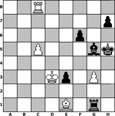 game notation in PGN-format [Event "Bremer Schl"] [Site "www.myChess.de"] [Date "2015.11.01"] [Round "1"] [White "Erich"] [Black "Cuibono"] [ECO "A05"] [WhitemyELO "2119"] [BlackmyELO "2047"] [Result "1/2-1/2"] [TimeControl "10/3456000"] [WhiteDays "240"] [BlackDays "149"] [MyChessNo "100978"] 1. Nf3 Nf6 2. c4 g6 3. Nc3 d5 4. cxd5 Nxd5 5. e4 Nxc3 6. bxc3 Bg7 7. Be2 c5 8. O-O Nc6 9. Rb1 O-O 10. Qa4 Ne5 11. Nxe5 Bxe5 12. f4 Bg7 13. e5 Bd7 14. Qa3 b6 15. Bf3 Bf5 16. Ra1 Rc8 17. Qxa7 g5 18. Re1 gxf4 19. a4 e6 20. a5 bxa5 21. Qxa5 Bh6 22. Qxd8 Rfxd8 23. Ra2 Bg5 24. Be4 Bxe4 25. Rxe4 Kg7 26. Kf2 Kg6 27. Rc4 Kf5 28. Kf3 Rd3+ 29. Ke2 Rd5 30. Ra7 Rxe5+ 31. Kf2 Rf8 32. Ra5 Rb8 33. Rcxc5 Rxc5 34. Rxc5+ e5 35. Rc7 Kg6 36. Ba3 e4 37. Bb4 e3+ 38. dxe3 fxe3+ 39. Kg3 Re8 40. c4 Re4 41. Rc8 Kh5 42. Be1 Rf4 43. h4 Rxh4 44. Kf3 Rh1 45. Ke2 Rg1 46. g3 f6 47. c5 Rg2+ 48. Kd3 Rg1 49. Ke2 Rg2+ 50. Kd3 Rg1 51. Ke2 Rg2+ 52. Kd3 Rg1 1/2-1/2 position notation in FEN-format 2R5/7p/5p2/2P3bk/8/3Kp1P1/8/4B1r1 - - - 11 53 Captured white pieces: Captured black pieces: Click on a captured piece in order to display the desired move!