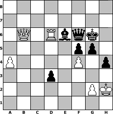 game notation in PGN-format [Event "Aschermittwoch 2014"] [Site "www.myChess.de"] [Date "2014.03.06"] [Round "1"] [White "Koprek"] [Black "deepsabel"] [ECO "D51"] [WhitemyELO "2065"] [BlackmyELO "2032"] [Result "1-0"] [TimeControl "10/3456000"] [WhiteDays "184"] [BlackDays "204"] [MyChessNo "93348"] 1. d4 d5 2. c4 e6 3. Nc3 Nf6 4. Bg5 Nbd7 5. cxd5 exd5 6. e3 c6 7. Bd3 Be7 8. Nge2 O-O 9. Qc2 Re8 10. O-O h6 11. Bh4 Ne4 12. Bxe7 Qxe7 13. Rae1 Ndf6 14. f3 Nxc3 15. Nxc3 Qd6 16. Qf2 Be6 17. h3 Rad8 18. a3 Nd7 19. Bb1 Nb6 20. f4 f6 21. Qc2 f5 22. Ne2 Nc4 23. Nc1 Bc8 24. Rf3 c5 25. Nb3 b6 26. Qc1 g6 27. Bd3 Ba6 28. Rg3 Kh7 29. Qc3 Re7 30. a4 Rde8 31. Bxc4 Bxc4 32. Nd2 cxd4 33. Qxd4 Ba6 34. b4 Bb7 35. h4 Rc8 36. b5 Rcc7 37. Ra1 a6 38. bxa6 Bxa6 39. Rb1 Re6 40. Nf3 Rc4 41. Qa1 Rxe3 42. Ng5+ hxg5 43. Rxe3 gxh4 44. Re8 d4 45. Rbe1 Rc7 46. R1e5 Bc4 47. Qe1 Qf6 48. R5e7+ Rxe7 49. Rxe7+ Kh6 50. Rd7 d3 51. Kh2 g5 52. Qb4 Be6 53. Rd6 Kg6 54. Qxb6 1-0 position notation in FEN-format 8/8/1Q1Rbqk1/5pp1/P4P1p/3p4/6PK/8 - - - 0 54 Captured white pieces: Captured black pieces: Click on a captured piece in order to display the desired move!