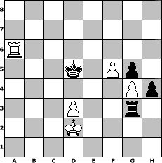 game notation in PGN-format [Event "Sommeranfang 2013"] [Site "www.myChess.de"] [Date "2013.06.21"] [Round "1"] [Board "2"] [White "Erich"] [Black "deepsabel"] [ECO "C48"] [WhitemyELO "2054"] [BlackmyELO "1998"] [Result "1/2-1/2"] [TimeControl "10/2592000"] [WhiteDays "30"] [BlackDays "29"] [MyChessNo "88947"] 1. e4 e5 2. Nf3 Nc6 3. Nc3 Nf6 4. Bb5 Nd4 5. Nxd4 exd4 6. Nd5 Nxd5 7. exd5 Qe7+ 8. Qe2 c6 9. Bc4 Qxe2+ 10. Bxe2 b6 11. O-O Bd6 12. Bf3 Bb7 13. Re1+ Kd8 14. dxc6 dxc6 15. d3 Kc7 16. Bd2 c5 17. Bxb7 Kxb7 18. g3 Rhe8 19. Kg2 Kc6 20. Kf3 Kd5 21. a4 a6 22. Bf4 Bxf4 23. Kxf4 f6 24. Kg4 g6 25. h3 Re5 26. f4 h5+ 27. Kf3 Ree8 28. b3 g5 29. a5 b5 30. f5 Rac8 31. Rab1 Rxe1 32. Rxe1 c4 33. bxc4+ bxc4 34. g4 h4 35. Re7 cxd3 36. cxd3 Rc3 37. Rd7+ Kc6 38. Rxd4 Ra3 39. Ke4 Rxa5 40. Rd8 Ra4+ 41. Ke3 Ra1 42. Rf8 Kd5 43. Rxf6 Rh1 44. Rxa6 Rxh3+ 45. Kd2 Rg3 46. Ra5+ Kd6 47. Ra6+ Kd5 1/2-1/2 position notation in FEN-format 8/8/R7/3k1Pp1/6Pp/3P2r1/3K4/8 - - - 6 48 Captured white pieces: Captured black pieces: Click on a captured piece in order to display the desired move!