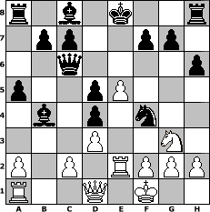 game notation in PGN-format [Event "Kohlenpottspringerturnier"] [Site "www.myChess.de"] [Date "2010.06.01"] [Round "1"] [White "Steppenwolf"] [Black "Winston"] [ECO "C61"] [WhitemyELO "1146"] [BlackmyELO "1456"] [Result "0-1"] [TimeControl "10/2592000"] [WhiteDays "50"] [BlackDays "60"] [MyChessNo "65975"] 1. e4 e5 2. Nf3 Nc6 3. Bb5 Nd4 4. Nxd4 exd4 5. O-O Qg5 6. d3 Qxb5 7. Bf4 Qxb2 8. Nd2 Qc3 9. Re1 h6 10. Rb1 a5 11. e5 Bb4 12. Kf1 Qc6 13. Re2 Ne7 14. Ne4 d5 15. Ng3 Ng6 16. Ra1 Nxf4 0-1 position notation in FEN-format r1b1k2r/1pp2pp1/2q4p/p2pP3/1b1p1n2/3P2N1/P1P1RPPP/R2Q1K2 - kq - 0 17 Captured white pieces: Captured black pieces: Click on a captured piece in order to display the desired move!