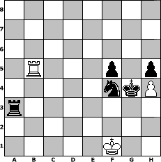 game notation in PGN-format [Event "Winterspiele"] [Site "www.myChess.de"] [Date "2008.12.29"] [Round "1"] [White "Juliette2103"] [Black "sprinterde"] [ECO "B06"] [WhitemyELO "1461"] [BlackmyELO "1646"] [Result "0-1"] [TimeControl "10/864000"] [WhiteDays "09"] [BlackDays "59"] [MyChessNo "51082"] 1. e4 g6 2. c3 d6 3. d4 Nf6 4. Bd3 Bg7 5. Be3 c6 6. Nd2 Qb6 7. Qc2 Ng4 8. Bf4 e5 9. h3 Nxf2 10. Kxf2 exf4 11. Ngf3 c5 12. d5 c4+ 13. Ke2 Qe3+ 14. Kf1 cxd3 15. Qd1 b5 16. Qb3 Bd7 17. Re1 Qc5 18. e5 dxe5 19. Nxe5 O-O 20. Nxd7 Nxd7 21. Ne4 Qb6 22. g4 fxg3 23. d6 d2 24. Rd1 Rfe8 25. Nxg3 Qe3 26. Kg2 Be5 27. c4 Qxb3 28. axb3 Bxb2 29. Rxd2 Be5 30. Re1 bxc4 31. bxc4 Rac8 32. Rc2 Rc6 33. Ne4 f5 34. Ng5 Rxd6 35. Nf3 Kf7 36. c5 Rc6 37. Rd2 Nxc5 38. Nxe5+ Kg8 39. Nxc6 Rxe1 40. Nxa7 Ne4 41. Rd8+ Kg7 42. Nc6 Re2+ 43. Kg1 Nf6 44. Nd4 Re3 45. Kg2 Ra3 46. Rb8 h5 47. Rb7+ Kh6 48. Rb6 Nd5 49. Nxf5+ Kg5 50. Rb5 Nf4+ 51. Kf1 gxf5 52. h4+ Kg4 0-1 position notation in FEN-format 8/8/8/1R3p1p/5nkP/r7/8/5K2 - - - 1 53 Captured white pieces: Captured black pieces: Click on a captured piece in order to display the desired move!