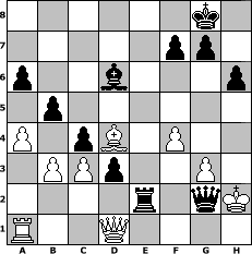 game notation in PGN-format [Event "Mannschaftsturnier der letzen Mohikan3er"] [Site "www.myChess.de"] [Date "2018.06.01"] [Round "1"] [White "Andylein1989"] [Black "alibengali"] [ECO "C70"] [WhitemyELO "1709"] [BlackmyELO "1729"] [Result "0-1"] [TimeControl "10/2592000"] [WhiteDays "106"] [BlackDays "063"] [MyChessNo "112289"] 1. e4 e5 2. Nf3 Nc6 3. Bb5 a6 4. Ba4 b5 5. Bb3 Nf6 6. d3 Be7 7. c3 Bb7 8. Nbd2 O-O 9. Nf1 h6 10. Ng3 d5 11. Bd2 dxe4 12. dxe4 Re8 13. Qc1 Bf8 14. Nf5 Nxe4 15. Be3 Qf6 16. Ng3 Nxg3 17. hxg3 e4 18. Nd4 Ne5 19. Bc2 c5 20. Nb3 Nd3+ 21. Bxd3 exd3 22. O-O Qc6 23. f3 c4 24. Na5 Qe6 25. Re1 Qd7 26. Nxb7 Qxb7 27. Bd4 Bd6 28. f4 Qd7 29. Kh2 Rxe1 30. Qxe1 Re8 31. Qd1 Re2 32. b3 Qc6 33. a4 Qxg2# 0-1 position notation in FEN-format 6k1/5pp1/p2b3p/1p6/P1pB1P2/1PPp2P1/4r1qK/R2Q4 - - - 0 34 Captured white pieces: Captured black pieces: Click on a captured piece in order to display the desired move!