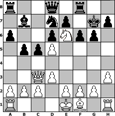 game notation in PGN-format [Event "Ostdeutschland"] [Site "www.myChess.de"] [Date "2008.08.12"] [Round "1"] [White "paul"] [Black "Seneca"] [ECO "B07"] [WhitemyELO "1280"] [BlackmyELO "1477"] [Result "1-0"] [TimeControl "10/2592000"] [WhiteDays "26"] [BlackDays "42"] [MyChessNo "47108"] 1. e4 d6 2. Nc3 Nf6 3. Nf3 g6 4. h3 Bg7 5. d3 a6 6. Bg5 c5 7. Qd2 O-O 8. Bh6 b5 9. Nd5 Nxd5 10. exd5 Bb7 11. Bxg7 Kxg7 12. Qc3+ f6 13. Ng5 Nd7 14. Ne6+ 1-0 position notation in FEN-format r2q1r2/1b1np1kp/p2pNpp1/1ppP4/8/2QP3P/PPP1PPP1/R3KB1R - KQ - 3 14 Captured white pieces: ![]() ![]() ![]() ![]() ![]() ![]() ![]() ![]() ![]() ![]() ![]() ![]() ![]() ![]() ![]() Captured black pieces: ![]() ![]() ![]() ![]() ![]() ![]() ![]() ![]() ![]() ![]() ![]() ![]() ![]() ![]() ![]() Click on a captured piece in order to display the desired move!