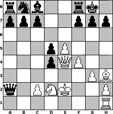 game notation in PGN-format [Event "4. Frankenwaldturnier"] [Site "www.myChess.de"] [Date "2007.09.06"] [Round "1"] [White "Schefsche"] [Black "Andreas"] [ECO "C21"] [WhitemyELO "1468"] [BlackmyELO "1668"] [Result "0-1"] [TimeControl "10/864000"] [WhiteDays "05"] [BlackDays "08"] [MyChessNo "37914"] 1. e4 e5 2. d4 exd4 3. Nf3 Nf6 4. Bg5 Be7 5. Bxf6 Bxf6 6. e5 Qe7 7. Qe2 Bg5 8. Nxg5 Qxg5 9. Qe4 Qc1+ 10. Ke2 Qxb2 11. g3 Qxa1 12. Bh3 Qxa2 13. Nd2 O-O 14. f4 d5 0-1 position notation in FEN-format rnb2rk1/ppp2ppp/8/3pP3/3pQP2/6PB/q1PNK2P/7R - - - 0 15 Captured white pieces: Captured black pieces: Click on a captured piece in order to display the desired move!