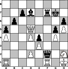 game notation in PGN-format [Event "LASKER 2016/1916"] [Site "www.myChess.de"] [Date "2016.10.26"] [Round "1"] [White "Helmut48"] [Black "martinus"] [ECO "D57"] [WhitemyELO "2030"] [BlackmyELO "1757"] [Result "1-0"] [TimeControl "10/2592000"] [WhiteDays "087"] [BlackDays "118"] [MyChessNo "105389"] 1. d4 d5 2. c4 e6 3. Nc3 Nf6 4. Bg5 Be7 5. e3 O-O 6. Nf3 h6 7. Bh4 Ne4 8. Bxe7 Qxe7 9. cxd5 Nxc3 10. bxc3 exd5 11. Bd3 Nc6 12. Rb1 b6 13. Qe2 Re8 14. O-O Bb7 15. Qc2 Qd6 16. Rfe1 Re7 17. a4 a5 18. Nh4 g6 19. Nf3 Kg7 20. h3 Rf8 21. Rb2 f5 22. g3 Bc8 23. h4 Re4 24. h5 g5 25. Bxe4 fxe4 26. Nh2 Qe6 27. Qe2 Qf5 28. g4 Qe6 29. Rc2 Ne7 30. c4 Bd7 31. Ra1 dxc4 32. Qxc4 Nd5 33. Rcc1 Qf6 34. Qxd5 Qxf2+ 35. Kh1 Rf7 36. Rf1 1-0 position notation in FEN-format 8/2pb1rk1/1p5p/p2Q2pP/P2Pp1P1/4P3/3P1q1N/R4R1K - - - 3 36 Captured white pieces: Captured black pieces: Click on a captured piece in order to display the desired move!