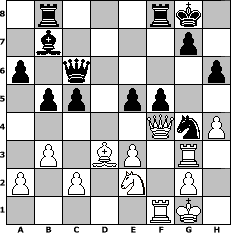 game notation in PGN-format [Event "Sommerferien 2010"] [Site "www.myChess.de"] [Date "2010.06.20"] [Round "2"] [White "Papale"] [Black "sprinterde"] [ECO "C01"] [WhitemyELO "1682"] [BlackmyELO "1668"] [Result "0-1"] [TimeControl "10/2592000"] [WhiteDays "58"] [BlackDays "84"] [MyChessNo "66432"] 1. e4 e6 2. d4 d6 3. Nf3 a6 4. Nc3 Be7 5. Bd3 Nf6 6. O-O Nc6 7. Re1 O-O 8. e5 dxe5 9. dxe5 Nd7 10. Ne4 Ndxe5 11. Nxe5 Nxe5 12. Re3 f5 13. Nc3 Ng4 14. Rh3 Bc5 15. Be3 Bxe3 16. fxe3 b5 17. Qf3 Rb8 18. Rf1 Qd6 19. Ne2 c5 20. b3 Bb7 21. Qf4 Qc6 22. Rg3 h6 23. h4 e5 0-1 position notation in FEN-format 1r3rk1/1b4p1/p1q4p/1pp1pp2/5QnP/1P1BP1R1/P1P1N1P1/5RK1 - - - 0 24 Captured white pieces: Captured black pieces: Click on a captured piece in order to display the desired move!