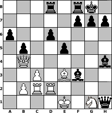 game notation in PGN-format [Event "3. Norderstedter DENK MAL Open 2012"] [Site "www.myChess.de"] [Date "2012.02.08"] [Round "1"] [White "borsti"] [Black "UPS"] [ECO "B20"] [WhitemyELO "1222"] [BlackmyELO "1625"] [Result "0-1"] [TimeControl "10/2592000"] [WhiteDays "30"] [BlackDays "30"] [MyChessNo "79795"] 1. e4 c5 2. d4 cxd4 3. Qxd4 Nc6 4. Qd1 d6 5. Bb5 Bd7 6. Bxc6 Bxc6 7. Nc3 e6 8. Nf3 Be7 9. Be3 Nf6 10. Qd3 O-O 11. O-O a6 12. a4 Qa5 13. Bd2 Qh5 14. Rfe1 Rad8 15. Be3 Ng4 16. h3 Nf6 17. Qe2 Nxe4 18. Nxe4 Bxe4 19. Nd4 Qg6 20. f3 Bc6 21. c3 Bd7 22. Rac1 Bxa4 23. Qc4 Bd7 24. Red1 b5 25. Qb4 e5 26. Ne2 Bxh3 27. Kf1 Bxg2+ 28. Ke1 Bxf3 29. Rd2 Qh5 30. Ng1 Qh1 31. Rcc2 Bh4+ 0-1 position notation in FEN-format 3r1rk1/5ppp/p2p4/1p2p3/1Q5b/2P1Bb2/1PRR4/4K1Nq - - - 6 32 Captured white pieces: ![]() ![]() ![]() ![]() ![]() ![]() ![]() ![]() ![]() ![]() ![]() ![]() ![]() ![]() ![]() Captured black pieces: ![]() ![]() ![]() ![]() ![]() ![]() ![]() ![]() ![]() ![]() ![]() ![]() ![]() ![]() ![]() Click on a captured piece in order to display the desired move!