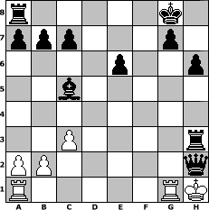 game notation in PGN-format [Event "Schlusslichterturnier Nr.2"] [Site "www.myChess.de"] [Date "2010.10.25"] [Round "1"] [White "Hobbykegler"] [Black "hape50"] [ECO "C41"] [WhitemyELO "1124"] [BlackmyELO "1352"] [Result "0-1"] [TimeControl "10/2592000"] [WhiteDays "20"] [BlackDays "30"] [MyChessNo "69322"] 1. e4 e5 2. Nf3 d6 3. d4 exd4 4. Nxd4 h6 5. Nc3 Nf6 6. Bc4 Nbd7 7. O-O Be7 8. Bf4 Ne5 9. Re1 Nxc4 10. Qe2 Ne5 11. Nd5 Nxd5 12. exd5 O-O 13. Qh5 Bg4 14. Ne6 fxe6 15. Qxe5 dxe5 16. Bxe5 Qxd5 17. h3 Qc5 18. c3 Qxf2+ 19. Kh1 Bxh3 20. gxh3 Qf3+ 21. Kg1 Bc5+ 22. Kh2 Qf2+ 23. Kh1 Rf3 24. Rg1 Rxh3+ 25. Bh2 Qxh2# 0-1 position notation in FEN-format r5k1/ppp3p1/4p2p/2b5/8/2P4r/PP5q/R5RK - - - 0 26 Captured white pieces: Captured black pieces: Click on a captured piece in order to display the desired move!