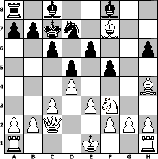 game notation in PGN-format [Event "Rheingold"] [Site "www.myChess.de"] [Date "2021.01.17"] [Round "1"] [White "Achimkogge"] [Black "alpacino"] [ECO "D00"] [WhitemyELO "1423"] [BlackmyELO "1257"] [Result "1-0"] [TimeControl "10/2592000"] [WhiteDays "58"] [BlackDays "60"] [MyChessNo "120777"] 1. d4 d5 2. c3 c6 3. Bf4 Nd7 4. Nf3 h6 5. e3 Ngf6 6. Bd3 Nh5 7. Be5 e6 8. Nbd2 g6 9. Bxh8 f6 10. Bxg6+ Ke7 11. Bxh5 Nb6 12. Qc2 f5 13. Ne5 Kd6 14. Nf7+ Kd7 15. Nxd8 Kxd8 16. Bf6+ Kd7 17. Nf3 Kc7 18. Bf7 Nd7 19. Bh4 1-0 position notation in FEN-format r1b2b2/ppkn1B2/2p1p2p/3p1p2/3P3B/2P1PN2/PPQ2PPP/R3K2R - KQ - 7 19 Captured white pieces: Captured black pieces: Click on a captured piece in order to display the desired move!