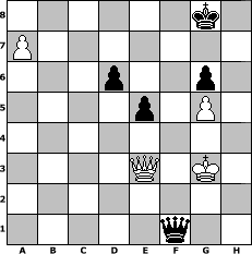 game notation in PGN-format [Event "Schneeturnier"] [Site "www.myChess.de"] [Date "2010.02.08"] [Round "2"] [White "Grubengeist"] [Black "Erich"] [ECO "B33"] [WhitemyELO "1905"] [BlackmyELO "1500"] [Result "1/2-1/2"] [TimeControl "10/2592000"] [WhiteDays "134"] [BlackDays "180"] [MyChessNo "63134"] 1. e4 c5 2. Nf3 Nc6 3. d4 cxd4 4. Nxd4 Nf6 5. Nc3 e5 6. Ndb5 d6 7. Nd5 Nxd5 8. exd5 Ne7 9. c4 Nf5 10. Bd3 Be7 11. O-O a6 12. Nc3 O-O 13. Kh1 Bd7 14. f4 f6 15. g4 Nd4 16. Be3 b5 17. cxb5 Nxb5 18. fxe5 Nxc3 19. bxc3 fxe5 20. Qc2 Rxf1+ 21. Rxf1 Kh8 22. h3 Bg5 23. Bxg5 Qxg5 24. Qf2 Rg8 25. Bxa6 h5 26. Qf7 Be8 27. Qf5 Qd2 28. Bd3 g6 29. Qf3 hxg4 30. hxg4 Bf7 31. c4 Rg7 32. Kg1 Bg8 33. Qe2 Qg5 34. a4 Ra7 35. Qd1 Kg7 36. Kg2 Rf7 37. Rxf7+ Bxf7 38. a5 Qe3 39. a6 Qc5 40. Qg1 Bxd5+ 41. cxd5 Qxd5+ 42. Kh2 Qxd3 43. a7 Qf3 44. Qg3 Qe4 45. Qf2 Qa4 46. g5 Kg8 47. Qb6 Qf4+ 48. Kg2 Qd2+ 49. Kf3 Qd3+ 50. Qe3 Qf1+ 51. Kg3 1/2-1/2 position notation in FEN-format 6k1/P7/3p2p1/4p1P1/8/4Q1K1/8/5q2 - - - 10 51 Captured white pieces: Captured black pieces: Click on a captured piece in order to display the desired move!