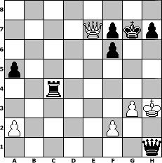 game notation in PGN-format [Event "Unter 1501"] [Site "www.myChess.de"] [Date "2020.08.24"] [Round "2"] [White "Hobbykegler"] [Black "gunni50"] [ECO "A20"] [WhitemyELO "996"] [BlackmyELO "1241"] [Result "0-1"] [TimeControl "10/2592000"] [WhiteDays "78"] [BlackDays "91"] [MyChessNo "119162"] 1. c4 e5 2. b3 Nf6 3. Bb2 Nc6 4. Qc2 Bc5 5. Nh3 O-O 6. g3 d6 7. Bg2 Ng4 8. O-O Qf6 9. Nc3 a6 10. Nd5 Qh6 11. Rae1 Nf6 12. Nxc7 Ra7 13. e3 b6 14. Nd5 Bxh3 15. d4 exd4 16. exd4 Bb4 17. Re2 Bxg2 18. Kxg2 b5 19. Nxb4 Nxb4 20. Qf5 Nc6 21. Rfe1 Raa8 22. d5 Nb4 23. h4 bxc4 24. bxc4 a5 25. Bd4 Rac8 26. Re7 Rxc4 27. Bxf6 gxf6 28. Re8 Qg6 29. Rxf8+ Kxf8 30. Qd7 Kg7 31. Re7 Nxd5 32. h5 Qxh5 33. Qxd6 Nxe7 34. Qxe7 Qd5+ 35. Kh3 Qh1# 0-1 position notation in FEN-format 8/4Qpkp/5p2/p7/2r5/6PK/P4P2/7q - - - 3 36 Captured white pieces: Captured black pieces: Click on a captured piece in order to display the desired move!