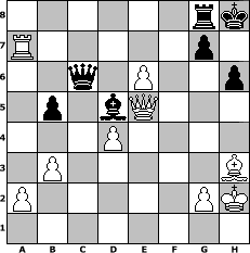 game notation in PGN-format [Event "Zug um Zug gegen Fr"] [Site "www.myChess.de"] [Date "2012.03.12"] [Round "1"] [White "espero"] [Black "Ziegert"] [ECO "A45"] [WhitemyELO "1616"] [BlackmyELO "1533"] [Result "1-0"] [TimeControl "10/2592000"] [WhiteDays "108"] [BlackDays "018"] [MyChessNo "80571"] 1. d4 Nf6 2. Bg5 e6 3. Nd2 Be7 4. e3 O-O 5. Bd3 d5 6. Ngf3 Nbd7 7. c3 c5 8. O-O c4 9. Bc2 Ne8 10. h4 f6 11. Bf4 Nd6 12. e4 dxe4 13. Bxd6 exf3 14. Bxe7 Qxe7 15. Qxf3 Nb6 16. h5 Qf7 17. Nxc4 Nxc4 18. Qd3 f5 19. Qxc4 Qxh5 20. Rae1 Rf6 21. Re3 Rg6 22. f4 Rh6 23. Rh3 Qg6 24. Rxh6 Qxh6 25. Bxf5 Kh8 26. Bh3 Bd7 27. Qc7 Bc6 28. Qf7 Bd5 29. b3 b5 30. f5 Qe3+ 31. Kh2 Qxc3 32. fxe6 h6 33. Qf4 Re8 34. Qe5 Qc6 35. Rf7 Rg8 36. Rxa7 1-0 position notation in FEN-format 6rk/R5p1/2q1P2p/1p1bQ3/3P4/1P5B/P5PK/8 - - - 0 36 Captured white pieces: Captured black pieces: Click on a captured piece in order to display the desired move!