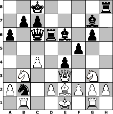 game notation in PGN-format [Event " Chess960 im Sommer, Herbst und Winter"] [Site "www.myChess.de"] [Date "2010.08.04"] [Round "2"] [White "rakl"] [Black "pepo47"] [Variant "Fischerrandom"] [SetUp "1"] [FEN "nrbkqbrn/pppppppp/8/8/8/8/PPPPPPPP/NRBKQBRN w KQkq - 0 1"] [WhitemyELO "1801"] [BlackmyELO "1524"] [Result "0-1"] [TimeControl "10/3456000"] [WhiteDays "118"] [BlackDays "119"] [MyChessNo "67425"] 1. d4 e5 2. Nb3 d5 3. Qa5 Nb6 4. Ng3 a6 5. e4 Be6 6. dxe5 O-O-O 7. Bg5 f6 8. Be3 dxe4+ 9. Ke1 Rd5 10. Qc3 Na4 11. Qc4 Rxe5 12. Qe2 f5 13. Qh5 g6 14. Qxh7 Rd5 15. Be2 Rd7 16. Qh4 Nf7 17. Bg5 Rh8 18. Qf4 Nxg5 19. Qxg5 Bh6 20. Qf6 Bg7 21. Qg5 Rd6 22. Qe3 Qc6 23. c4 Nxb2 0-1 position notation in FEN-format 2k4r/1pp3b1/p1qrb1p1/5p2/2P1p3/1N2Q1N1/Pn1PBPPP/1R2K1R1 - - - 0 24 Captured white pieces: Captured black pieces: Click on a captured piece in order to display the desired move!