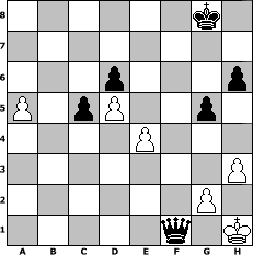 game notation in PGN-format [Event "STHLM"] [Site "www.myChess.de"] [Date "2010.03.25"] [Round "2"] [White "lasker"] [Black "Haki"] [ECO "E61"] [WhitemyELO "1408"] [BlackmyELO "1319"] [Result "0-1"] [TimeControl "10/1728000"] [WhiteDays "096"] [BlackDays "100"] [MyChessNo "64329"] 1. d4 Nf6 2. c4 g6 3. Nc3 Bg7 4. Nf3 O-O 5. e3 d6 6. Be2 e5 7. e4 Nc6 8. d5 Nb8 9. O-O c6 10. Rb1 cxd5 11. cxd5 Nbd7 12. h3 b6 13. Re1 Nc5 14. Qc2 Bd7 15. b4 Nb7 16. Bd2 a5 17. bxa5 Nxa5 18. Bd3 h6 19. Nb5 Nh5 20. a4 Nf4 21. Bxf4 exf4 22. Kh2 Rc8 23. Qd2 Bxb5 24. Bxb5 Bc3 25. Qxf4 g5 26. Qe3 Bxe1 27. Qxe1 f6 28. Qd2 Nc4 29. Qd3 Na5 30. Nd4 Rf7 31. Ne6 Qe7 32. Qe3 Nb7 33. Rc1 Rxc1 34. Qxc1 Nc5 35. Nxc5 bxc5 36. f3 Qe5+ 37. Kh1 f5 38. Bd3 fxe4 39. fxe4 Rf2 40. a5 Qg3 41. Bf1 Qf4 42. Qb1 Rxf1+ 43. Qxf1 Qxf1+ 0-1 position notation in FEN-format 6k1/8/3p3p/P1pP2p1/4P3/7P/6P1/5q1K - - - 0 44 Captured white pieces: Captured black pieces: Click on a captured piece in order to display the desired move!